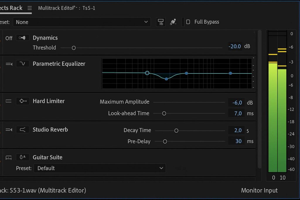 Audition punya Effects Rack real-time. Pasang EQ, compressor, de-esser, semua live. Putar track, tweak knob, langsung denger hasilnya. Waktu setup episode baru? 5 menit. Dan bisa save sebagai preset. Aku punya preset “Podcast Interview”, “Solo Monologue”, “Narrative Story”. Tinggal drag drop.