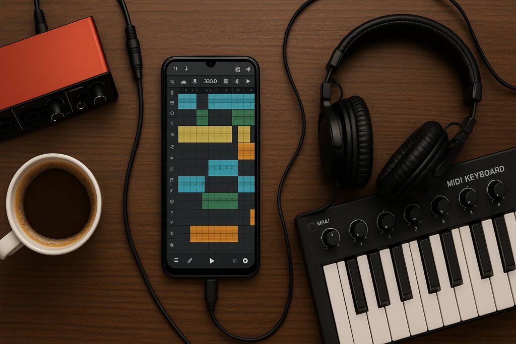 Gig elektronik di rooftop cafe. Laptop di rumah. Client minta edit struktur lagu 30 menit sebelum perform. Buka HP, duplicate pattern, swap section, export WAV. Selesai 8 menit. Desktop tak terjangkau, HP selalu di saku.
