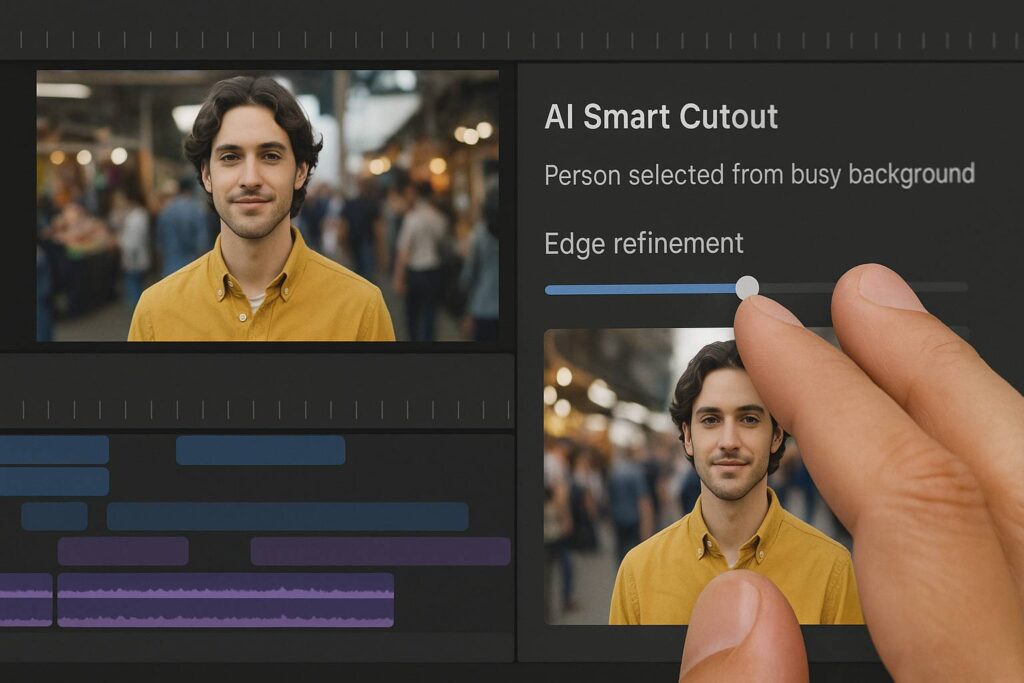AI Smart Cutout untuk konten sosmed, AI Audio Denoise untuk vlog, AI Text-Based Editing untuk rough cut.